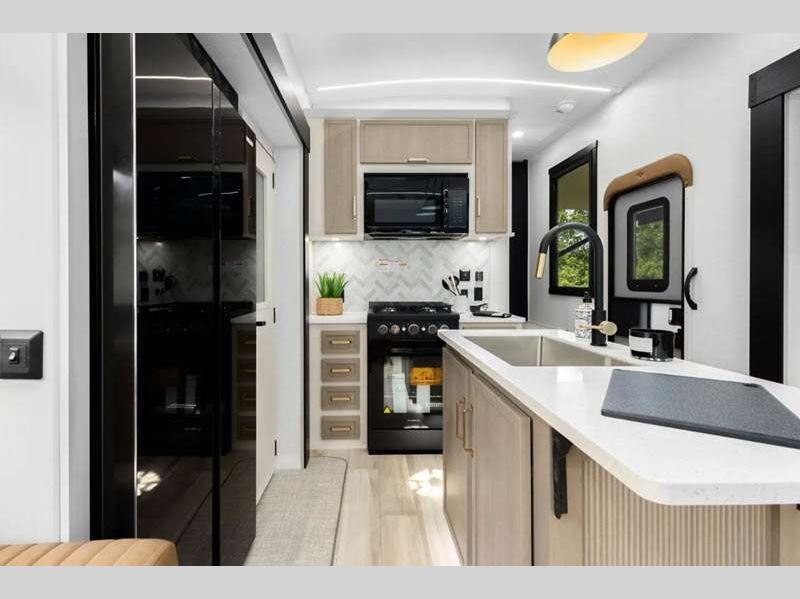 Sleeps 4 Slides 3 Length 33 ft 11 in Ext Width 8 ft Ext Height 13 ft 5 in Hitch Weight 1871 lbs Dry Weight 9380 lbs Cargo Capacity 2691 lbs Fresh Water Capacity 57 gals Grey Water Capacity 60 gals Black Water Capacity 32 gals Available Beds Custom King Refrigerator Type 12V Refrigerator Size 16 cu ft Cooktop Burners 3 Number of Awnings 1 Water Heater Type On Demand Tankless AC BTU 33000 btu TV Info LR 50" LED Smart TV Awning Info 13' with LED Lights Axle Count 2 Washer/Dryer Available Yes Shower Type Walk-In Shower Electrical Service 50 amp Similar Floorplans