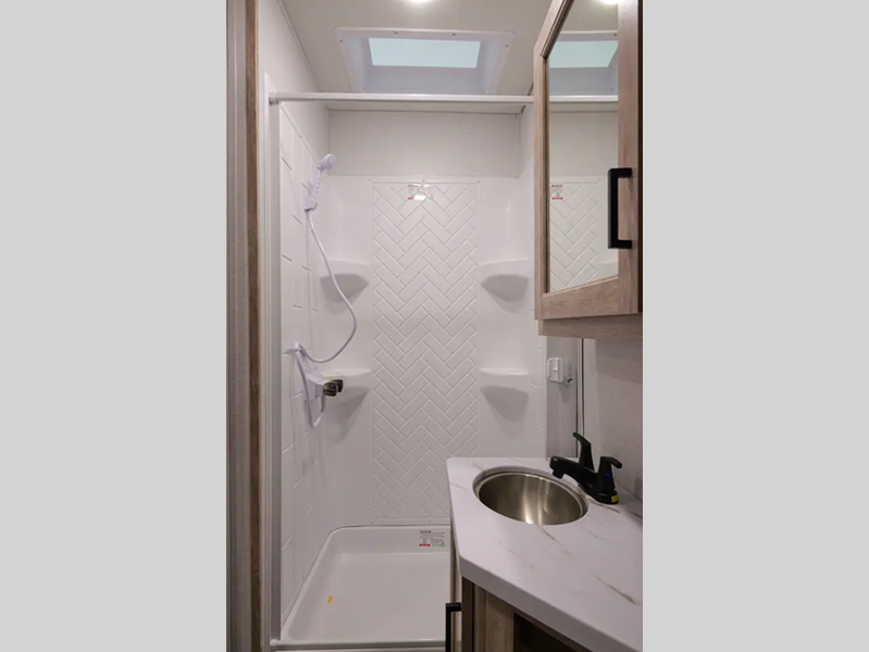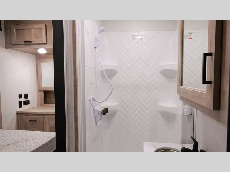 There is fiberglass flooring insulation that will withstand your many adventures plus a rear beaver tail frame for easy unloading and an external fuel cell with a pump. You will feel right at home with decorative glass cabinet doors and LED lights, and there is a tankless water heater to provide endless hot showers after trail riding. The Alumifoil insulated enclosed underbelly will help extend your camping season, and each model is back up camera ready if you want to make parking easier than ever.